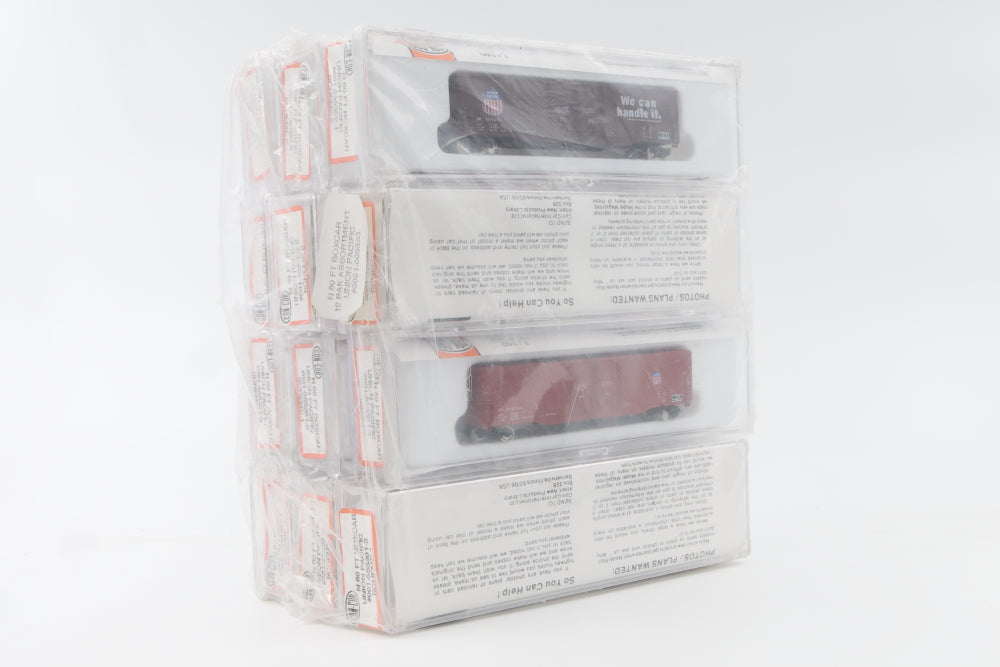 Con Cor N scale 12 pack, Union Pacific 60ft, Hi Cube Auto box cars, 2 different paint scheme, all cars have different numbers, metal wheels, rapido style couplers